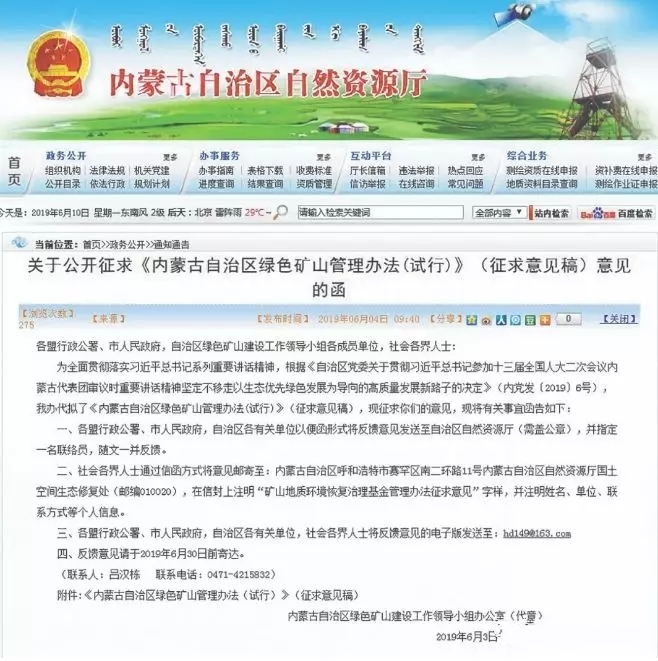 ■ 對各盟市上報并列入綠色礦山名錄的礦山,自治區綠色礦山建設領導小組辦公室征求自治區綠色礦山領導小組成員單位的意見后,向社會公告,接受監督。