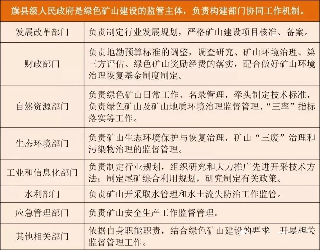 ■ 領導:自治區成立綠色礦山建設領導小組,統籌指導各級人民政府推進綠色礦山建設。各級人民政府應當加強對綠色礦山建設的領導。