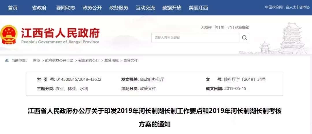 近日,江西省人民政府印發《2019年河長制湖長制工作要點》(以下簡稱要點)和《2019年河長制湖長制考核方案》,《要點》第16條要求如下: