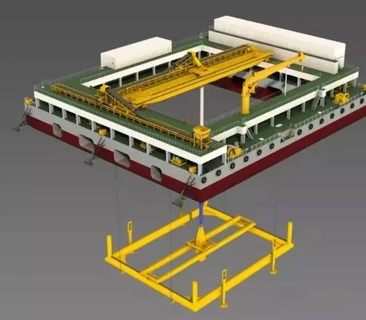 水下3D碎石整平清淤船由主船體、水下整平架兩部分組成,主船體為箱型“回”字型結構,船長62米、寬55.6米,整平作業設計水深60米,最大水深可突破100米。與傳統整平設備相比,該船具有以下亮點: