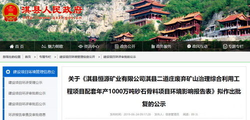 河南省鶴壁市將全市29個普通建筑石料礦山全部進行資源整合關閉,鶴壁市淇縣人民政府協議委托淇縣恒源礦業有限公司作為淇縣普通建筑石料礦山綜合整治工作的整合和開發實施主體,建設生產規模為年產1000萬噸砂石骨料項目,總投資52539萬元,其中環保投資7250萬元。