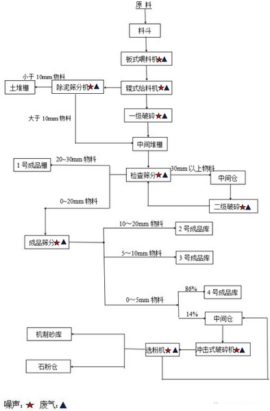 本項目破碎車間采用兩段破碎,多級篩分工藝將進廠石料篩分為兩個級別石粉,四種級別骨料。