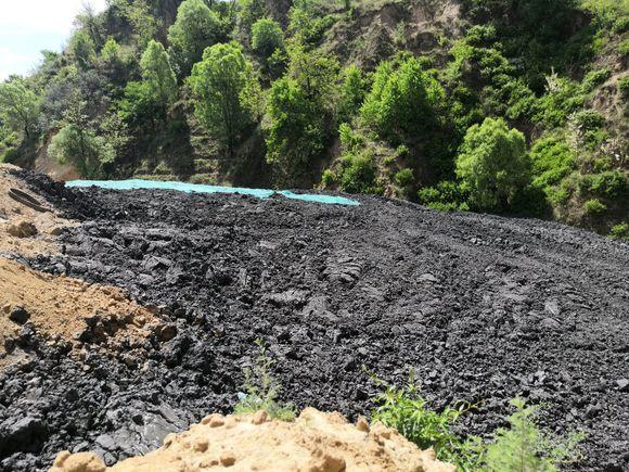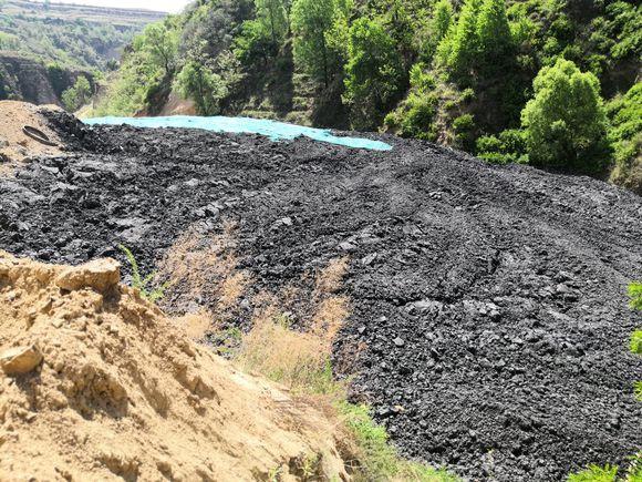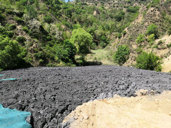 跟隨舉報人員,記者登上龍馬坡山頂,面前的一幕讓人震撼,只見整條溝都被田東洗煤廠圈占,前面是洗煤廠車間,后面的溝里已經被傾倒的煤泥堆滿了,烏黑裸露的煤泥和山坡上翠綠的植被形成了極大的反差。溝內已經烏黑一片,寸草不生。山坡上被推出了傾倒煤泥的道路,顯然此次還將持續傾倒煤泥。記者發現,傾倒煤泥的地方不僅僅是溝內,在旁邊的山洼里,也有大量煤泥直接傾倒在內,大量樹木被煤泥掩埋。