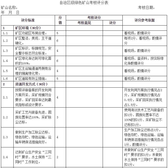 (二)考核??己私M織單位對申報材料進行審查認為符合考核條件的,組織設區市、縣(市、區)自然資源主管部門及專家進行實地考核、評分并形成考核意見后,將考核結果形成報告報送自治區自然資源主管部門組織審核。在符合基本條件的前提下,考核總分在80分(含80分)以上的礦山,方可通過自治區級綠色礦山考核。