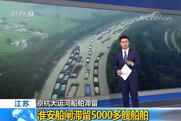 京杭大運河淮安船閘下游最低通航水位是6米,但6月7日以來淮安以南至寶應的航道水位偏低。水位偏低的原因是上游降水長時間偏少以及沿河農田灌溉用水增加。 據工作人員統計,目前淮安船閘上下游總待閘船舶數量已經超過了5000艘。