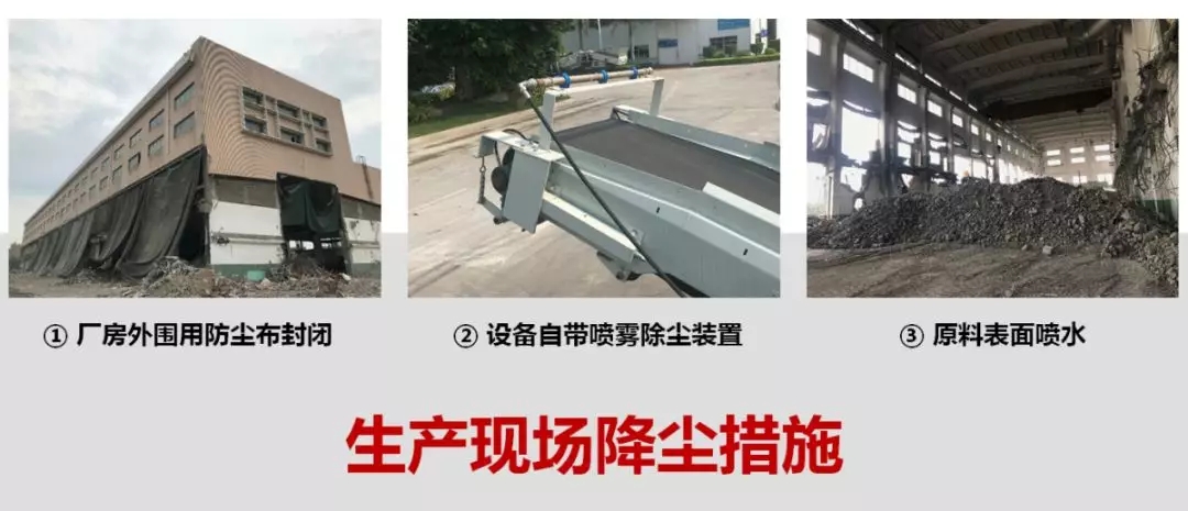 在環保高壓下,生產過程中的粉塵控制尤其關鍵。通過在廠房外圍用防塵布封閉、設備自帶噴霧除塵裝置、原料表明噴水等環保除塵措施,保證高效環保的生產中,減少粉塵排放。