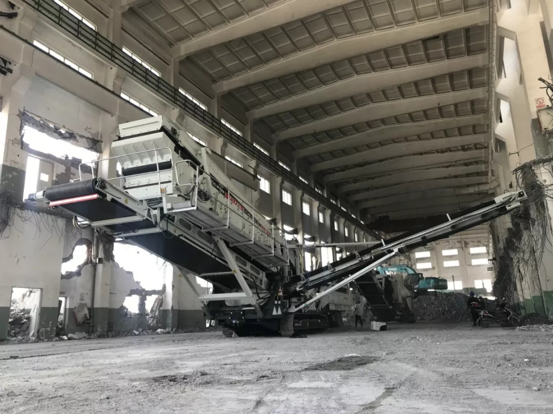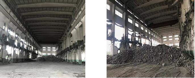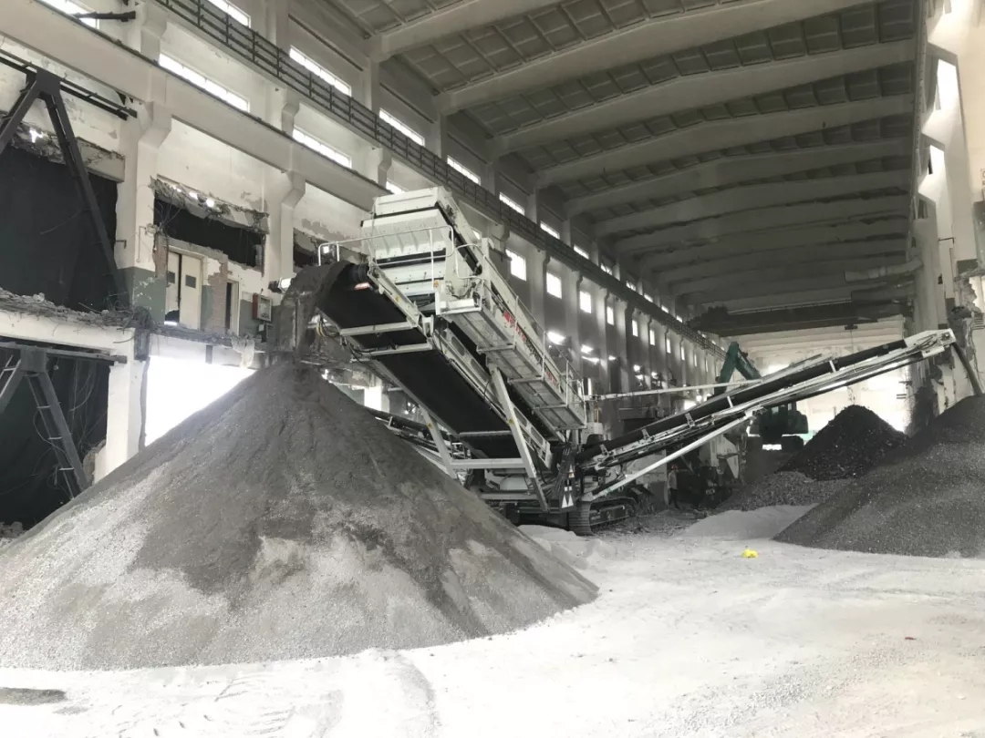 項目背景:該項目位于浙江省杭州市區某廢舊造紙廠拆除項目,當地有著嚴格的環保要求,所以生產線布置在廢棄廠房內,廠房不僅擁有足夠的生產空間,還能起到很好的降噪、降塵作用。所產生的建筑垃圾就地破碎篩分處理,變成再生砂石骨料。