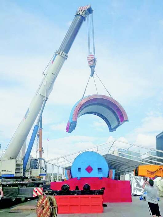 7月22日,工博會最重的展品,重達82噸的“大塊頭”——全球首臺永磁內裝式提升機在布展區完成吊裝。