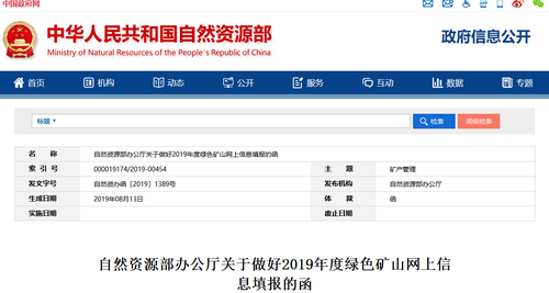 自然資源部辦公廳關(guān)于做好2019年度綠色礦山網(wǎng)上信息填報(bào)的函