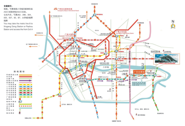 2、 搭乘地鐵:從地鐵廣州火車東站總站乘地鐵三號線(火車東站-體育西,坐2站)到體育西,轉乘地鐵三號線(天河客運站-番禺廣場,坐4站)到客村轉乘地鐵八號線(萬勝圍方向,坐3站)至新港東A出口出站后可抵達展館