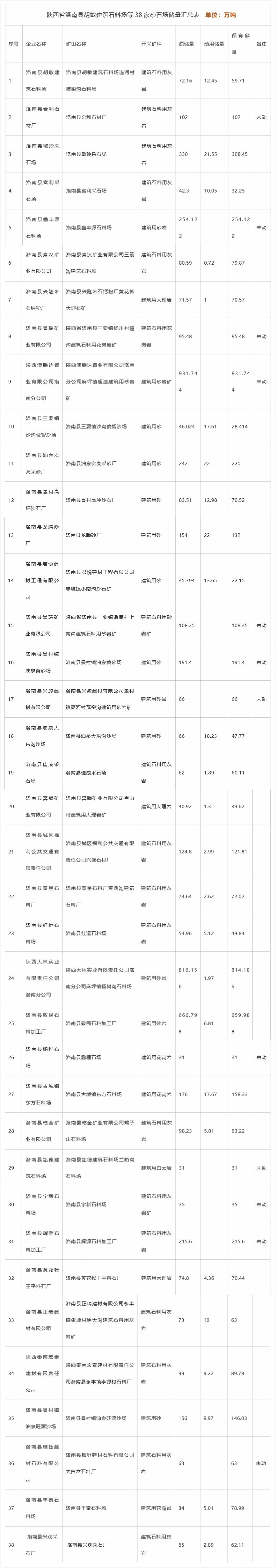 近日,陜西省商洛市洛南縣發布《關于洛南縣礦山儲量的公示》以下簡稱(《公示》),《公示》對陜西省洛南縣胡敏建筑石料場等38家砂石場儲量匯總。