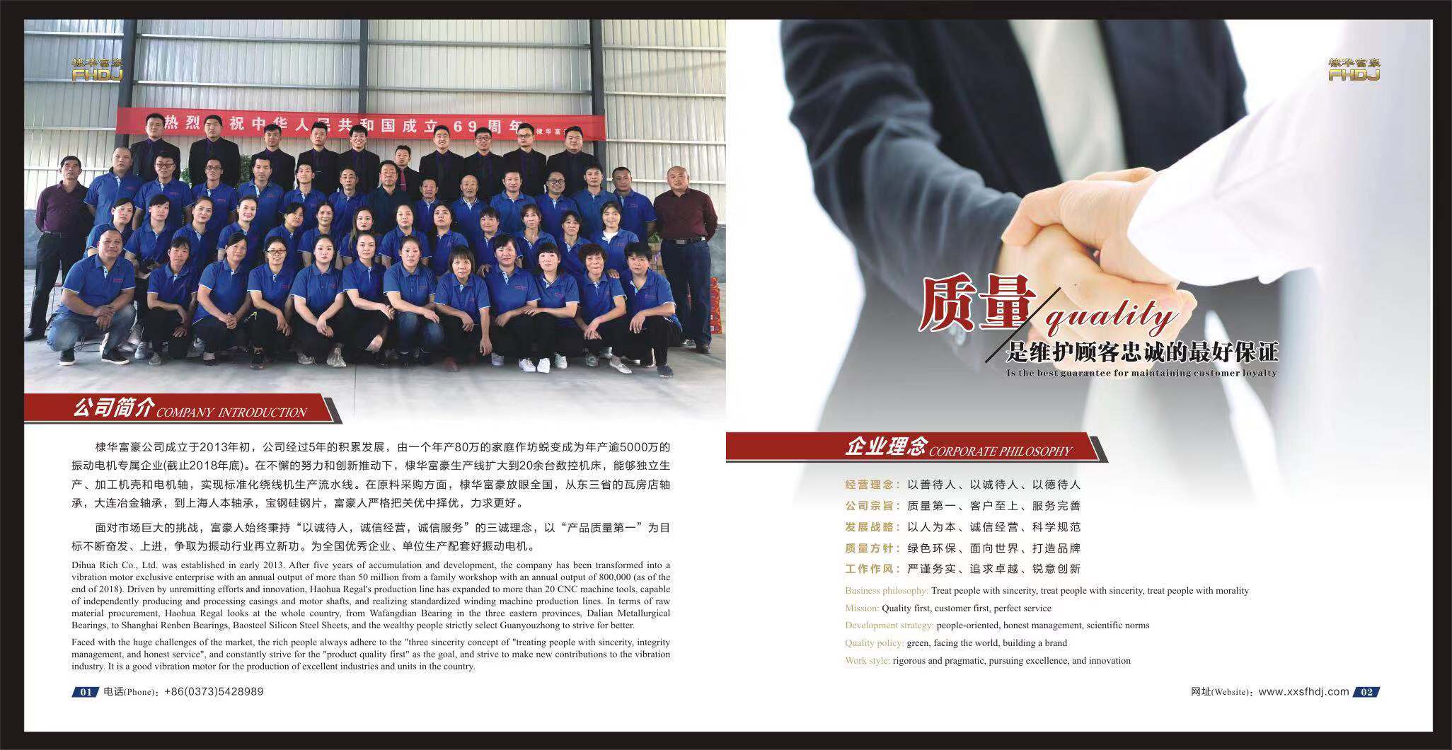 新鄉市富豪電機制造有限公司是一家專業生產振動電機的廠家,公司占地9000多平方,員工80人,電機設計專業技師5名。公司年生產銷售能力達三萬臺以上,公司擁有同行業最高端的加工中心,產品主要型號:VB、GBS、YZS、側板振動電機等。產品廣泛用于礦山機械、鑄造、煤礦篩選、冶金、醫藥、化工、糧食、電力、水泥等行業,公司已經通過國家強制性CCC認證,并被授予新鄉市守合同重信用單位。擁有雄厚的技術力量,先進的加工設備,一流的工藝水平,專業的銷售服務團隊。近年來公司快步發展,市場占有率逐年提高,已經在新鄉市(振動之鄉)多家同行業競爭對手中脫穎而出。公司始終以產品質量為發展的根本,為客戶提供高品質的振動電機和優質的服務為宗旨。
