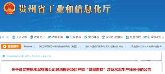 貴州省工業和信息化廳關于遵義賽德水泥有限公司異地搬遷項目產能“減量置換”涉及水泥生產線關停的公告