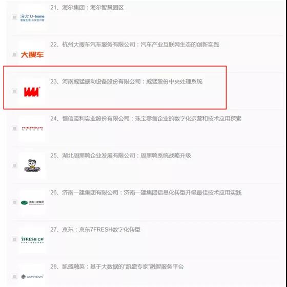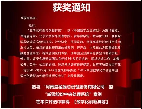 2019年11月19日,河南威猛振動設備股份有限公司的威猛股份中央處理系統案例獲得數字化創新典范。
