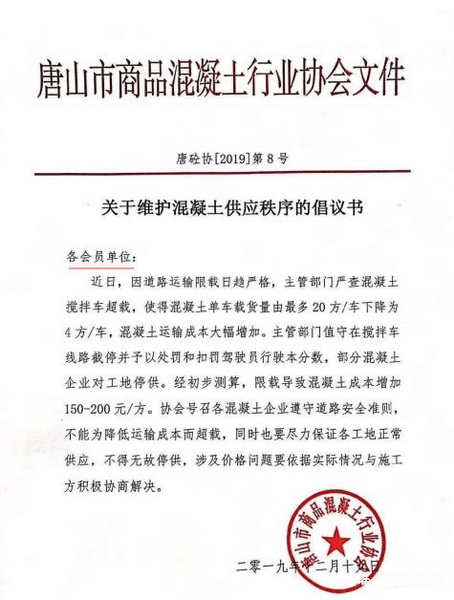 據(jù)悉,近日,唐山地區(qū)混凝土行業(yè)協(xié)會(huì)發(fā)文《關(guān)于維護(hù)混凝土供應(yīng)秩序的倡議書》第7、8號(hào)文件。文件分別對(duì)下游施工企業(yè)的采購(gòu)以及混凝土企業(yè)的供應(yīng)提出相關(guān)建議。近期唐山地區(qū)車輛限載,混凝土企業(yè)攪拌車載貨量由20方下降至4方,混凝土運(yùn)輸成本上升。經(jīng)初步測(cè)算,混凝土成本上升150-200元/方。