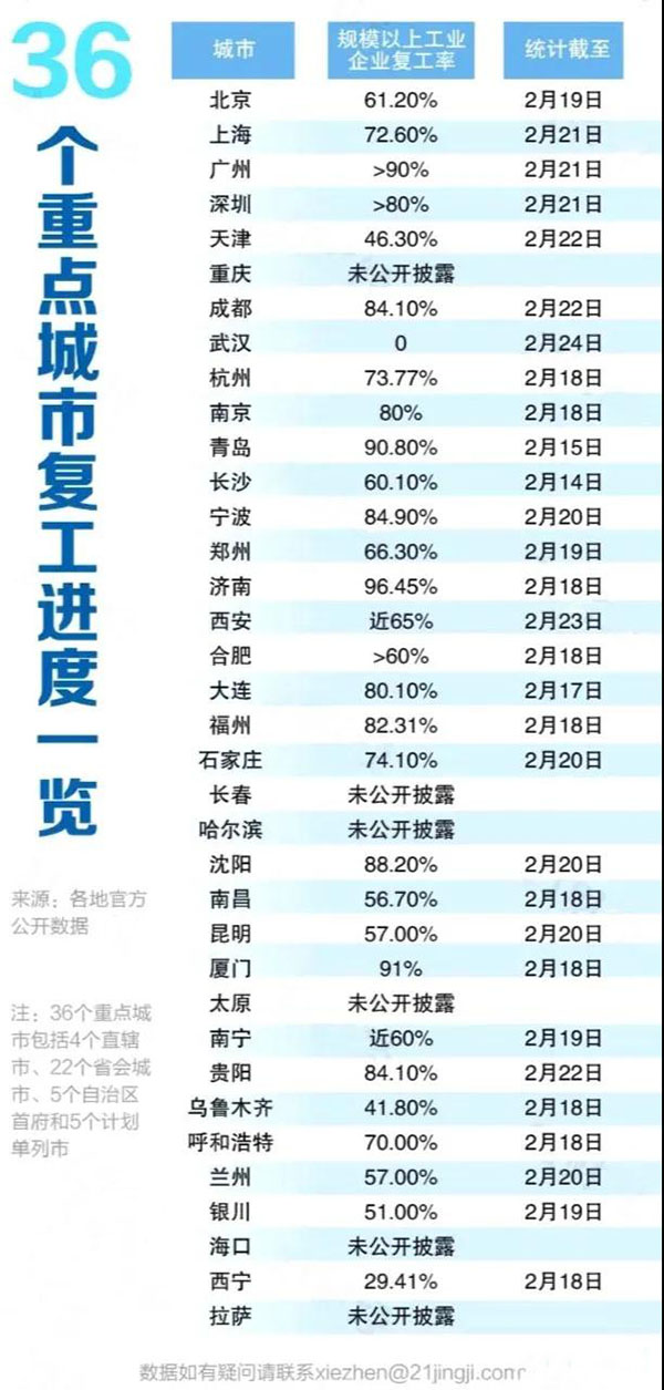 據(jù)了解,在36個主要城市(省會城市及計(jì)劃單列市)中,30城公布了企業(yè)復(fù)工復(fù)產(chǎn)進(jìn)度。其中,16個城市規(guī)上企業(yè)復(fù)工率超過70%,廣州、濟(jì)南、廈門、青島等城復(fù)工率已超過90%,領(lǐng)跑其他地區(qū)。