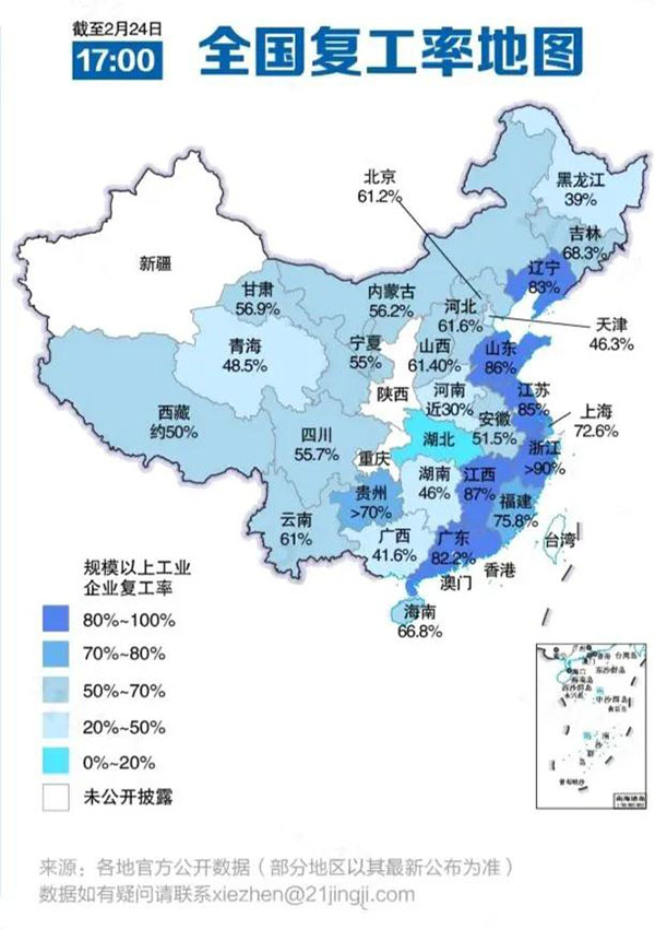 注:本文復(fù)工率數(shù)據(jù)來自各地官方最新發(fā)布的規(guī)模以上工業(yè)企業(yè)復(fù)工率數(shù)據(jù)。
