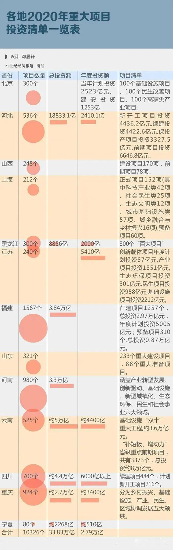 截至3月1日,包括北京、河北、山西、上海、黑龍江、江蘇、福建、山東、河南、云南、四川、重慶、寧夏等13個省市區發布了2020年重點項目投資計劃清單。這份投資清單共包括10326個項目,其中8個省份公布了計劃總投資額,共計33.83萬億元;另有8個省份公布了年度投資額,合計約2.79萬億元。