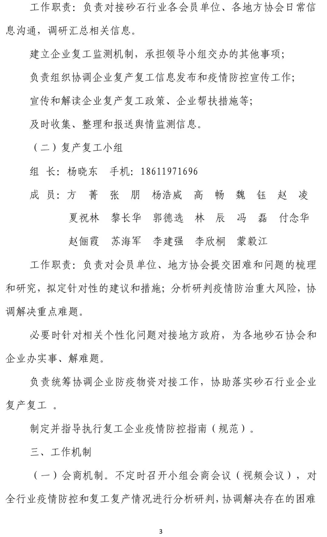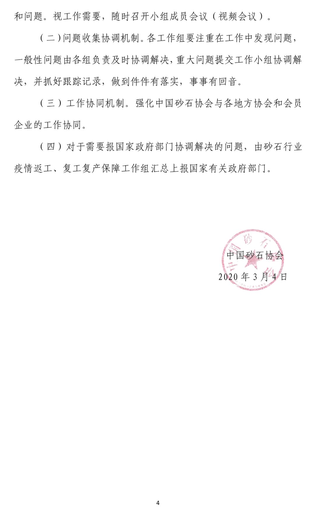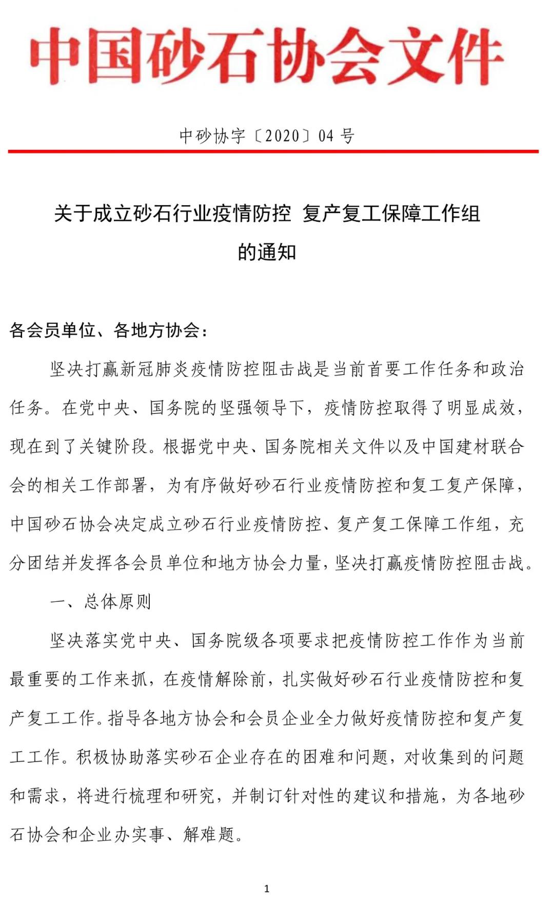 中國砂石協會根據黨中央、國務院的相關文件以及中國建材聯合會的相關工作部署,為有序做好砂石行業疫情防控和復工復產保障,決定成立砂石行業疫情防控、復工復產保障工作組,充分團結并發揮各會員單位和地方協會力量,堅決打贏疫情防控阻擊戰。 通知原文如下: