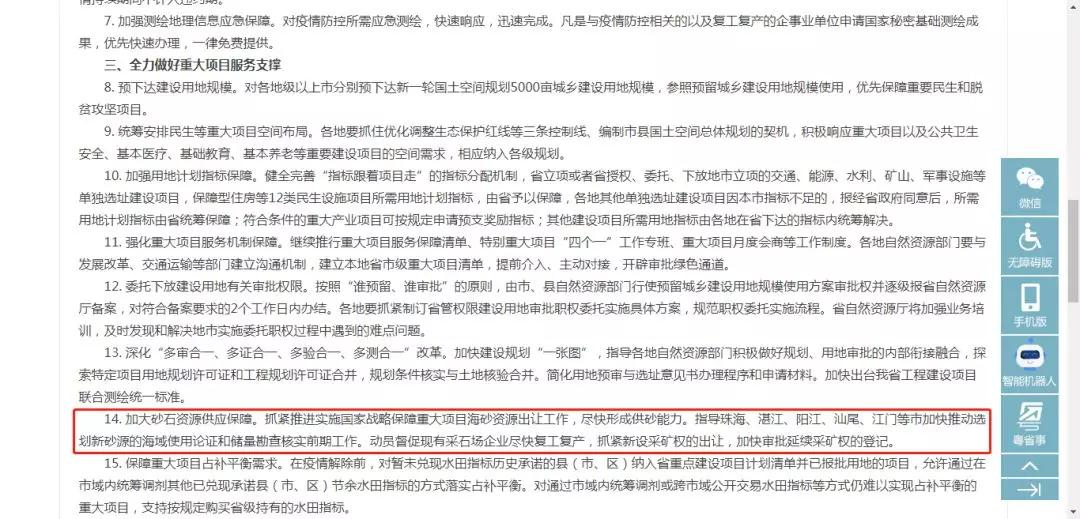 3月2日,廣東省自然資源廳發布了《關于全力統籌推進疫情防控和經濟社會發展加強自然資源保障服務的通知》(以下簡稱《通知》),要求各地市自然資源部門與相關單位全力做好重大項目服務支撐,加大砂石資源供應保障。