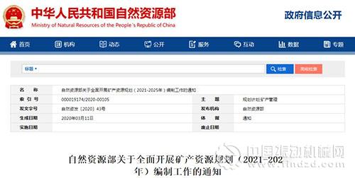 2020年3月12日,自然資源部發布《自然資源部關于全面開展礦產資源規劃(2021-2025年)編制工作的通知》(以下簡稱《通知》),公開征求相關部門意見。《通知》明確了礦產資源規劃的原則、時間段、編制重點、報批程序和工作保障等內容。