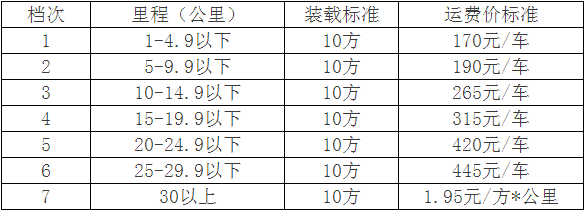 購砂價格包含兩項,第一項砂石價格暫定150元/方(待市政府出臺指導價格再做調整),第二項運輸費詳見下表: