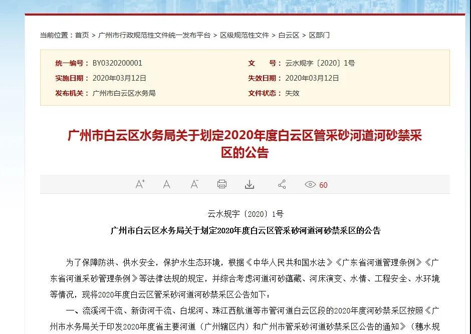 3月12日,廣州市白云區水務局發布關于劃定2020年度白云區管采砂河道河砂禁采區的公告,公告指出,白云區轄區內所有河道(河涌)劃定為2020年度河砂禁采區。