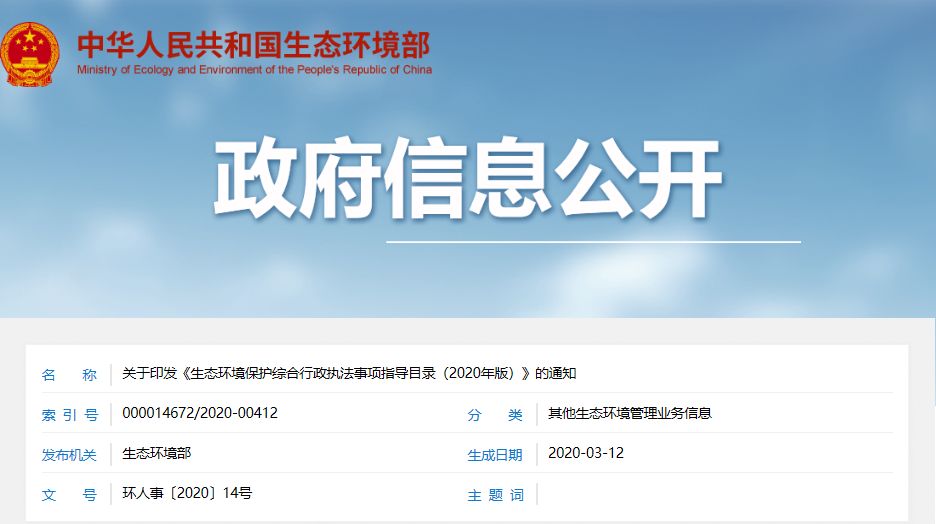 近日,生態環境部發布了關于印發《生態環境保護綜合行政執法事項指導目錄(2020年版)》(以下簡稱“《指導目錄》”)的通知,稱根據深化黨和國家機構改革有關安排部署,為貫徹落實《國務院辦公廳關于生態環境保護綜合行政執法有關事項的通知》(國辦函〔2020〕18號)要求,扎實推進生態環境保護綜合行政執法改革,現印發《生態環境保護綜合行政執法事項指導目錄(2020年版)》及說明。