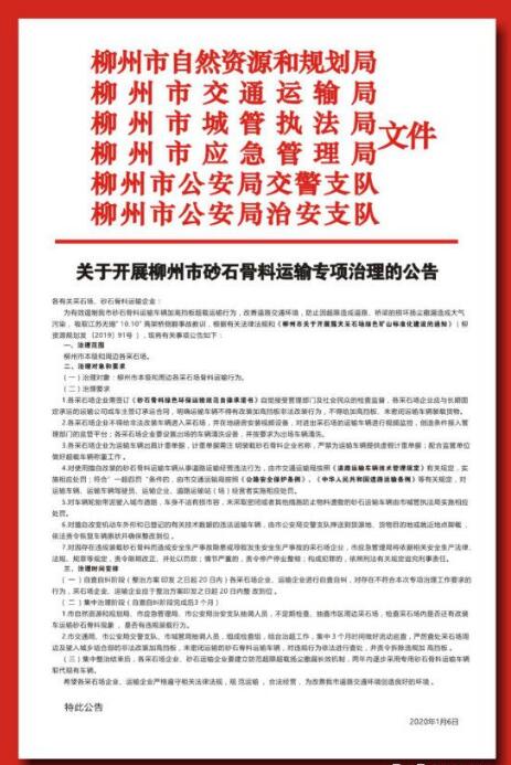 二、今年1月6日分別印發《柳州市自然資源和規劃局等六部門關于印發柳州市砂石骨料運輸專項治理實施方案的通知》(柳資源規劃通〔2020〕8號)、《柳州市自然資源和規劃局等六部門關于開展柳州市砂石骨料運輸專項治理的公告》。