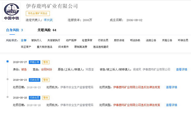 啟信寶信息顯示,伊春鹿鳴礦業有限公司成立于2006年8月,企業注冊資本2000萬元人民幣,屬于有色金屬礦采選業。經營范圍為鉬礦開采、選礦;礦產品經銷;鉬產品貨物進出口等。公司發起人分別為中鐵資源集團有限公司、黑龍江省第五地質勘查院。2018年8月18日、23日兩次受到伊春市安全生產監督管理局行政處罰。