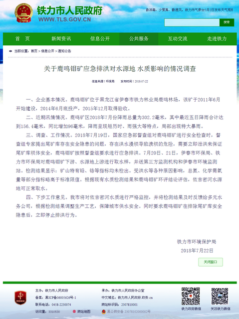 鐵力市環境保護局當時表示,鐵力市將對依吉密河水質進行嚴格監控,并將檢測結果及時反饋給多元水務公司,根據檢測結果調整生產工藝,保障城市供水安全。同時要求鹿鳴鉬礦在排除尾礦庫安全隱患后,立即停止排洪行為。