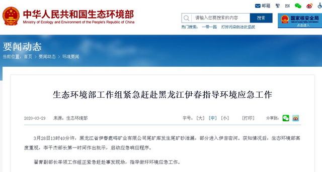 3月28日13時40分許,黑龍江省伊春鹿鳴礦業有限公司尾礦庫發生尾礦砂泄漏,部分進入伊吉密河。獲知情況后,生態環境部高度重視,啟動應急響應程序。