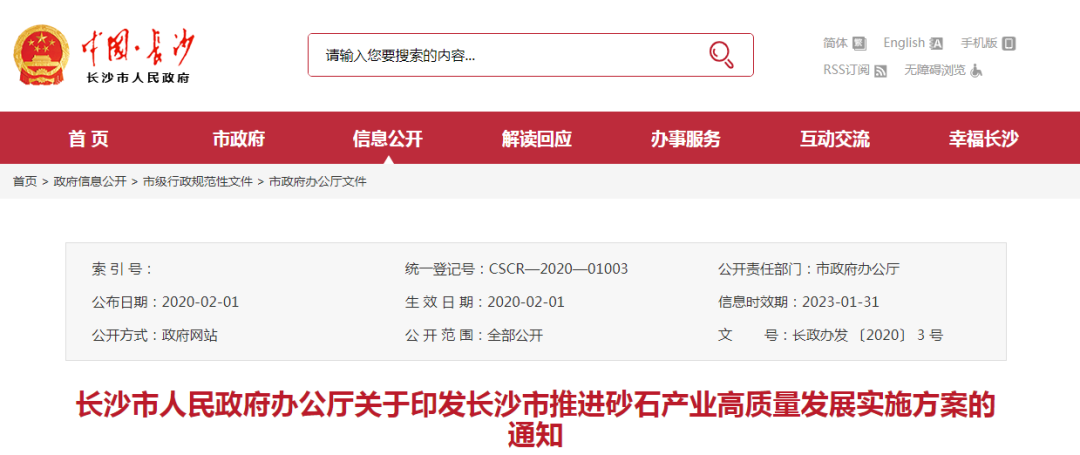 為加快推進生態文明建設,規范湖南省長沙市砂石產業有序高質量發展,保障建設用砂供應和質量安全,根據工業和信息化部等 10 部門 《關于推進機制砂石行業高質量發展的若干意見》(工信部聯原〔2019〕239號)和《湖南省人民政府辦公廳關于印發〈湖南省普通建筑材料用砂石土礦專項整治行動方案(2019—2021 年)〉的通知》(湘政辦發 〔2019〕54 號)精神,結合長沙實際,特制定發布《長沙市人民政府辦公廳關于長沙市推進砂石產業高質量發展實施方案》(以下簡稱《方案》) ,《方案》自2020年2月1日起執行,有效期3年。