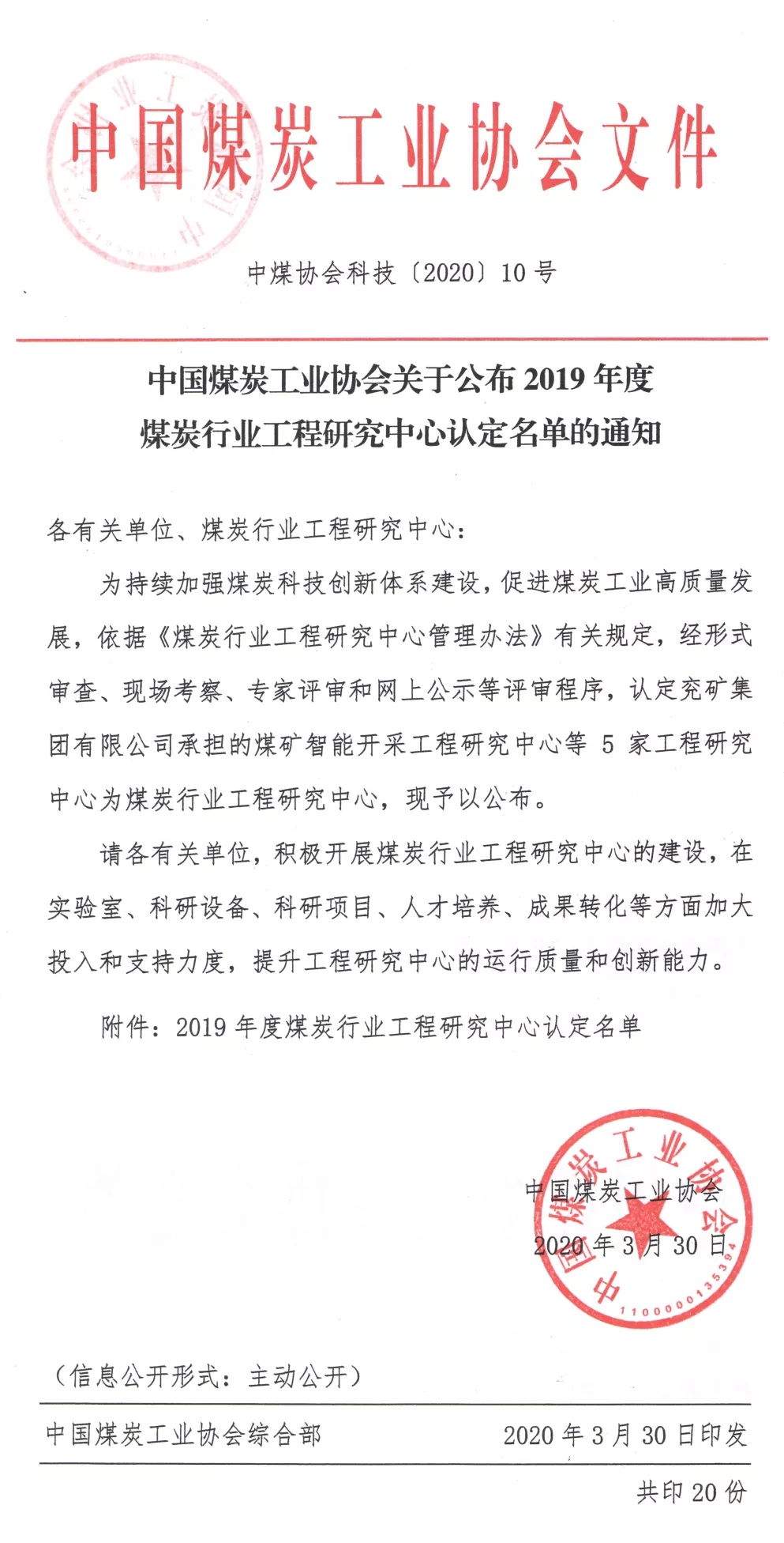 近日,中國煤炭工業協會下發《關于公布2019年度煤炭行業工程研究中心認定名單的通知》(中煤協會科技〔2020〕10號)文件,“煤炭行業智能選煤工程研究中心”正式獲批。該中心由中國煤炭加工利用協會發起,中國礦業大學、中煤科工集團北京華宇工程有限公司、神華神東煤炭集團有限責任公司、天津德通電氣股份有限公司、北京澤建五六選煤科技有限公司等五家單位聯合共建,以全面推進我國選煤廠智能化轉型升級和高質量發展為使命,熱誠歡迎相關單位和個人加入中心攜手共建! 中心主要職能 組織制定智能化選煤廠建設技術標準體系。 根據成員單位不同發展定位和特色,統籌研究開發先進適用智能化選煤新技術,以快速技術迭代打造成員單位核心競爭力,提高產業集中度。 推動現有選煤廠進行設備單機、關鍵環節、核心系統、生產車間等智能化升級改造。 組織創建智能化選煤廠、生產車間示范工程。 組織智能化科技成果鑒定、知識產權申請、專利申請、獎勵申報。 附:通知文件及附件