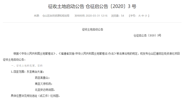 根據(jù)《中華人民共和國土地管理法》、《福建省實施<中華人民共和國土地管理法>辦法》等法律法規(guī)的規(guī)定,現(xiàn)發(fā)布倉山區(qū)建筑垃圾資源化項目征收土地啟動公告: