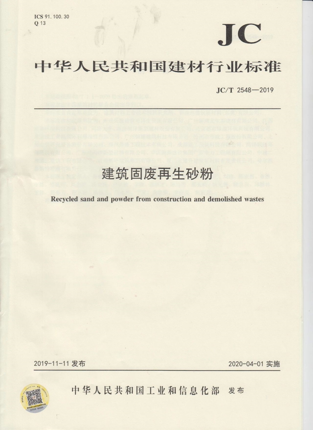 中華人民共和國工業與信息化部發布的《建筑垃圾再生砂粉》(JC/T2548-2019)行業標準,2020年4月1日起正式開始實施。