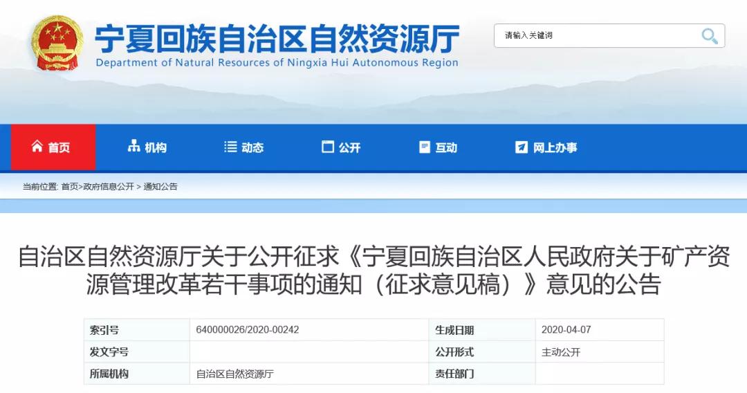 為深化“放管服”改革,貫徹落實礦業權出讓制度改革及《自然資源部關于推進礦產資源管理改革若干事項的意見(試行)》精神,近日,寧夏回族自治區自然資源廳發布《寧夏回族自治區政府關于礦產資源管理改革若干事項的通知(征求意見稿)》(以下簡稱《意見》)。