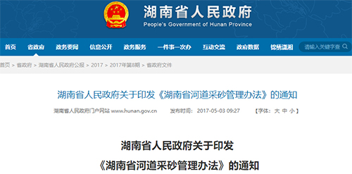據了解,2017年4月1日,湖南省人民政府印發《湖南省河道采砂管理辦法》,此次湖南省將“辦法”加快上升到“條例”,充分體現了當前河道采砂管理工作的重要性,以及面臨的新形勢。