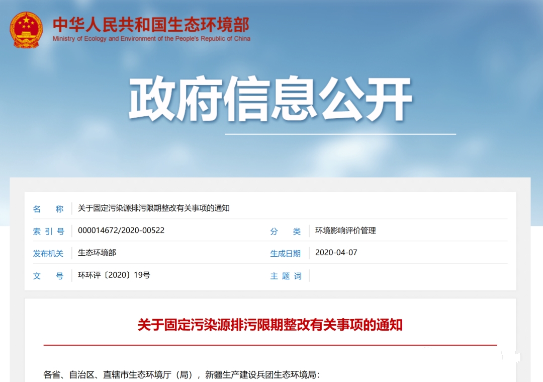 為深入貫徹落實黨的十九屆四中全會精神,加快推進固定污染源排污許可制度改革,實現固定污染源排污許可管理全覆蓋任務目標,根據《中華人民共和國環境保護法》《中華人民共和國大氣污染防治法》《中華人民共和國水污染防治法》和《國務院辦公廳關于印發控制污染物排放許可制實施方案的通知》(國辦發〔2016〕81號)等規定,現就排污限期整改有關事項通知如下: