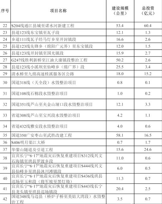 3月31日,四川省人民政府正式公布2020年全省重點項目完整名單。全省共列重點項目700個,計劃總投資44442.8億元,2020年預計投資6185.4億元。續建項目共484項,交通項目104項,其中,高速公路項目32項,國省干線及經濟干線項目45項。新開工項目共216項,交通項目32項,其中,高速公路項目9項,國省干線及經濟干線項目15項。