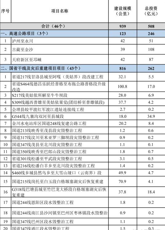 這批公路項目涉及瀘州、涼山、阿壩、甘孜、成都、綿陽、廣元、雅安、巴中、廣安、宜賓、樂山、攀枝花等13個市(州)。