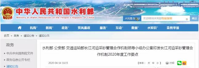 日前,水利部、公安部、交通運輸部按照《水利部公安部交通運輸部關于建立長江河道采砂管理合作機制的通知》要求,發布長江河道采砂管理合作機制2020年度工作要點。