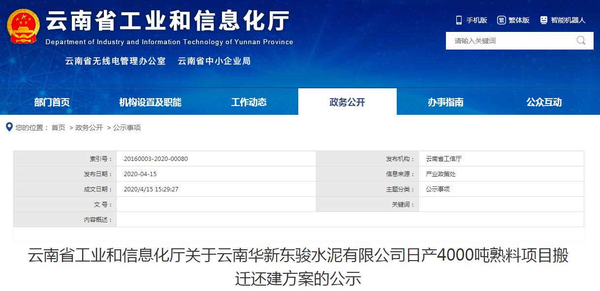 根據《工業和信息化部關于印發鋼鐵水泥玻璃行業產能置換實施辦法的通知》(工信部原〔2017〕337號)和《水泥玻璃行業產能置換實施辦法操作問答》有關規定,現將“云南華新東駿水泥有限公司日產4000噸熟料項目搬遷還建方案”予以公示。公示期為2020年4月16日至4月22日,如有異議,請在公示期內向云南省工業和信息化廳反映,歡迎社會公眾進行監督。