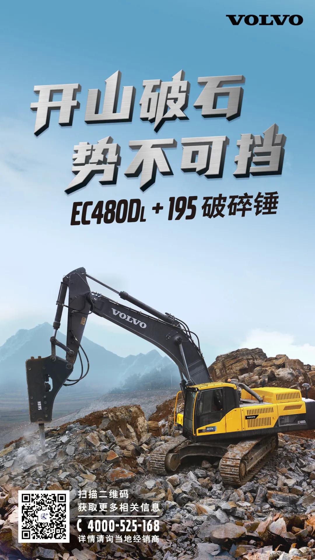 沃爾沃EC480DL挖掘機(jī)外號(hào)“礦山大力神”,配合195破碎錘使用更能如虎添翼,助力高效率、高質(zhì)量的作業(yè)。