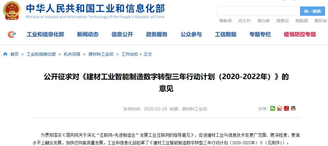 2020年2月28日,工業和信息化部起草了《建材工業智能制造數字轉型三年行動計劃(2020-2022年)》(征求意見稿),文件中對于機制砂石行業提出要重點形成砂石骨料破碎整形、級配調整、粉塵收集、廢水處理、物料儲運等各環節在線監測和智能控制的集成系統解決方案;大力培育智能工廠和數字礦山;建立5個建材行業智能制造創新中心,形成15套建材行業系統解決方案,突破50項建材領域智能制造關鍵共性技術,創新形成若干大數據、云計算、5G通信、工業互聯網等新一代技術使用場景。