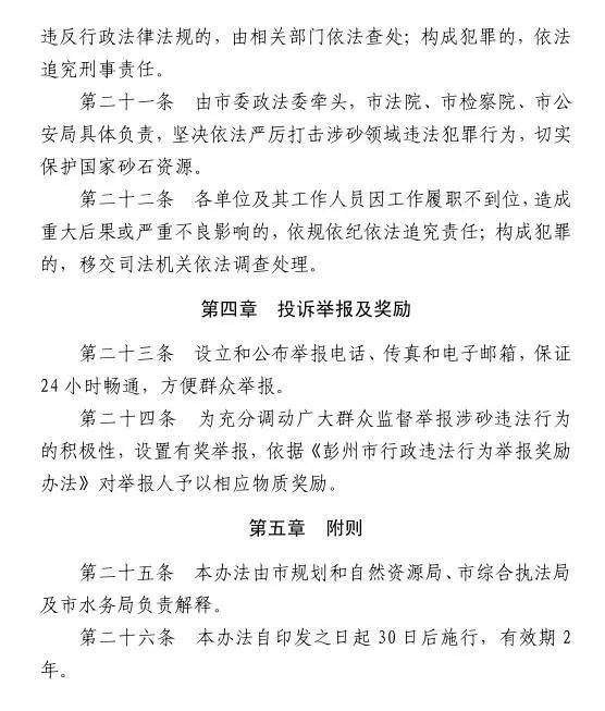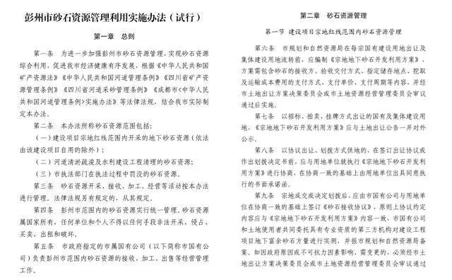 為進一步加強彭州市砂石資源管理,實現砂石資源綜合利用,促進全市經濟健康有序發展,根據相關法律法規,結合彭州市實際制定《辦法》?!掇k法》具體內容見下圖。