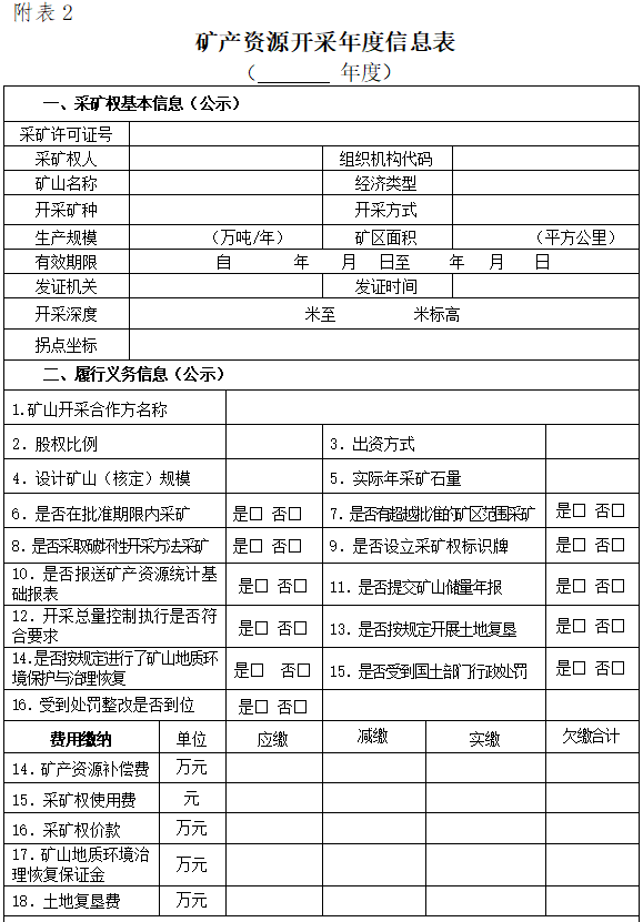 根據(jù)《礦業(yè)權(quán)人勘查開采信息公示辦法(試行)》,地?zé)帷⒌V泉水和建筑用砂石、粘土礦原則只填報礦產(chǎn)資源開采年度信息表中的一、二部分(采礦權(quán)基本信息、履行義務(wù)信息)內(nèi)容,具體由省級國土資源主管部門提出填報要求。