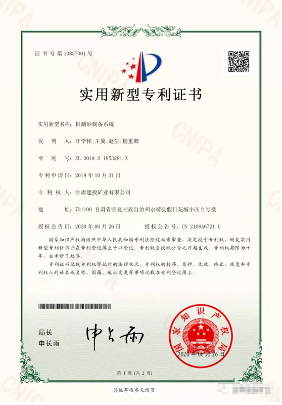 據悉,甘肅建投礦業有限公司永靖礦區申報的《機制砂制備系統》實用新型專利于2020年6月26日正式授權。
