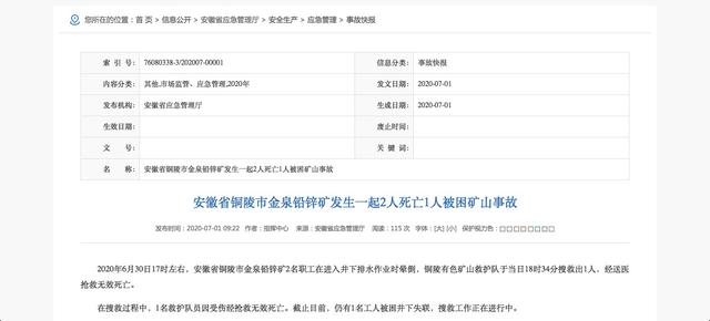 記者從安徽省應(yīng)急管理廳獲悉,2020年6月30日17時左右,安徽省銅陵市金泉鉛鋅礦2名職工在進入井下排水作業(yè)時暈倒。銅陵有色礦山救護隊于當(dāng)日18時34分搜救出1人,經(jīng)送醫(yī)搶救無效死亡。