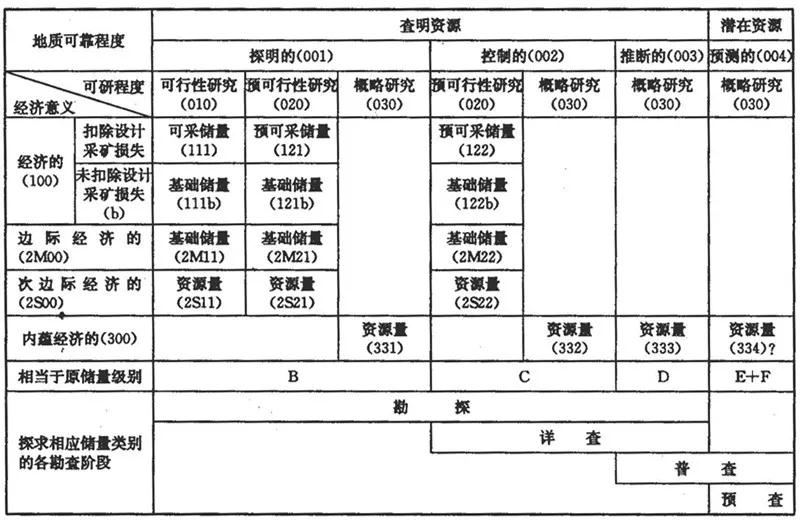 該標(biāo)準(zhǔn)根據(jù)地質(zhì)可靠程度將固體礦產(chǎn)資源/儲量分為探明的、控制的、推斷的和預(yù)測的,分別對應(yīng)于勘探、詳查、普查和預(yù)查四個勘探階段。該標(biāo)準(zhǔn)對保障礦產(chǎn)資源管理的有序進(jìn)行,促進(jìn)我國礦產(chǎn)資源勘查開發(fā)等發(fā)揮了重要作用。